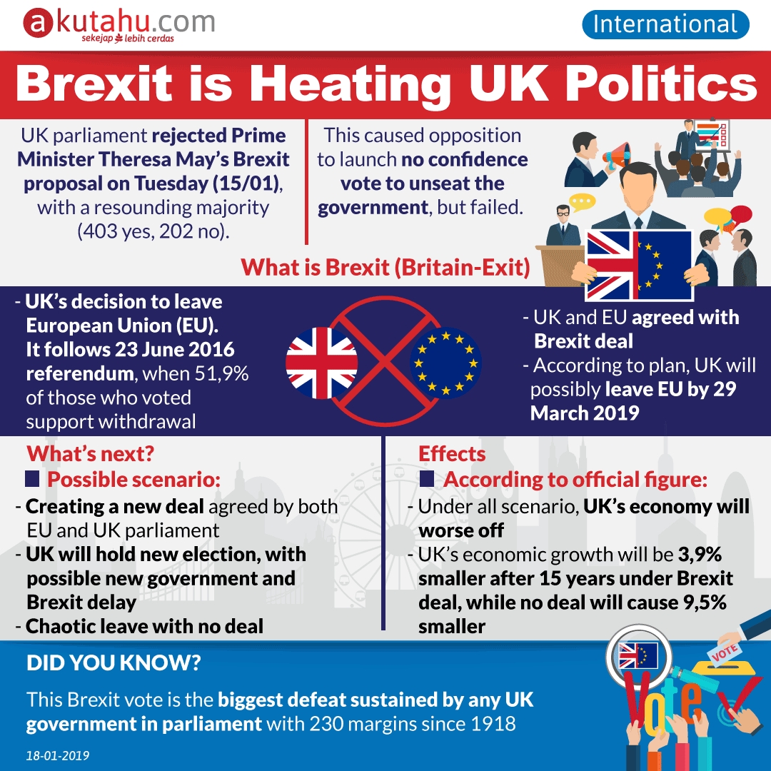 Parliament rejected UK’s Prime Minister proposal on Brexit, a UK planned withdrawal from European Union. This is heating UK’s politics right now.