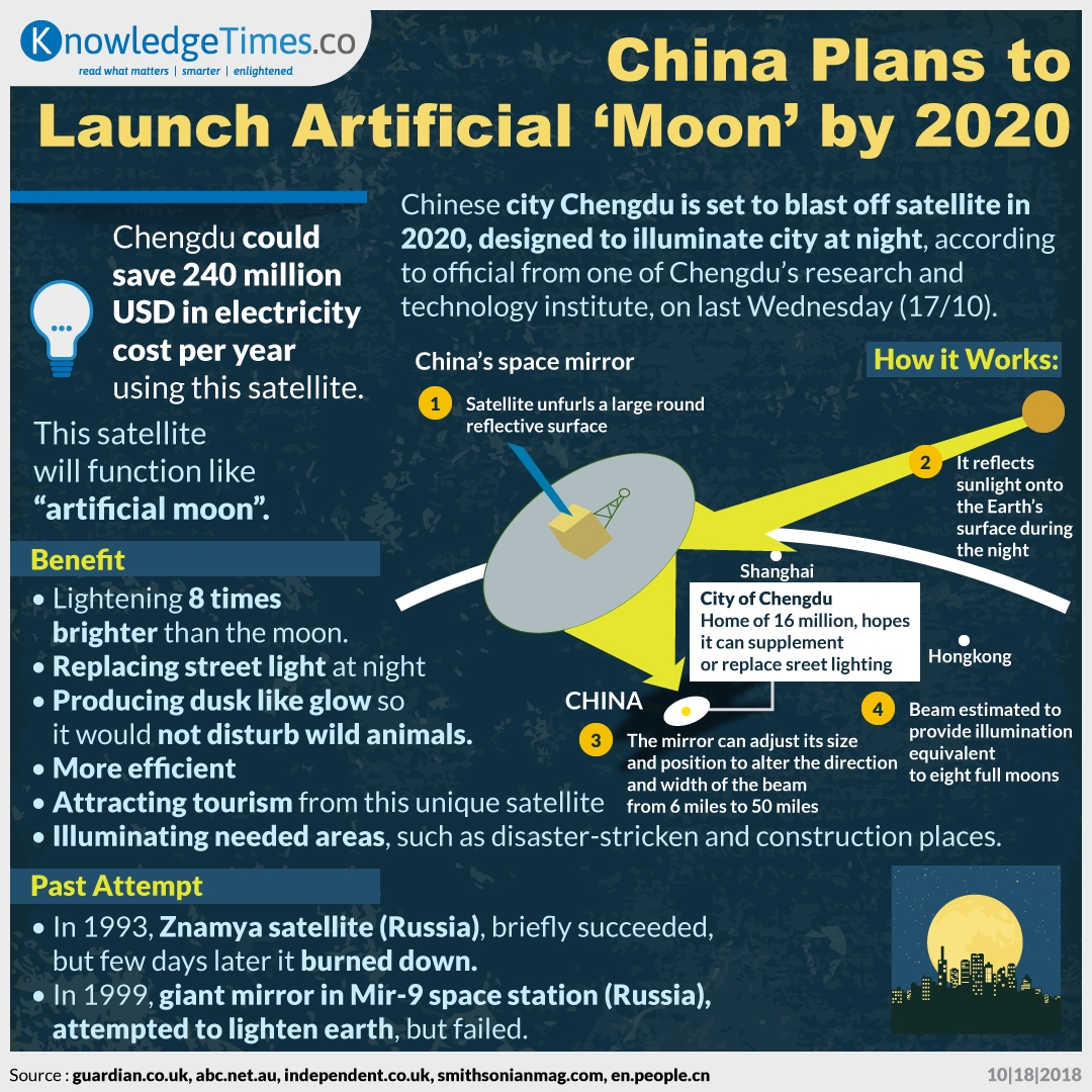 Chinese city, Chengdu, now tries to do some breakthrough on satellite technology. By 2020, they will launch an artificial moon to lighten at night without street light. This ambitious plan, although highlighting China’s thirst on innovation, has been done before by Russians, but ultimately failed.