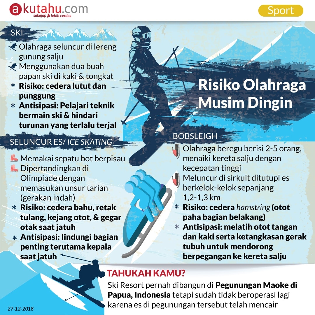 Menyambut Natal, di negara beriklim subtropis olahraga musim dingin menjadi pilihan. Akan tetapi beberapa jenis olahraga ini banyak membutuhkan kontak fisik yang bisa mengakibatkan cedera. kenali risiko dari jenis-jenis olahraga musim dingin