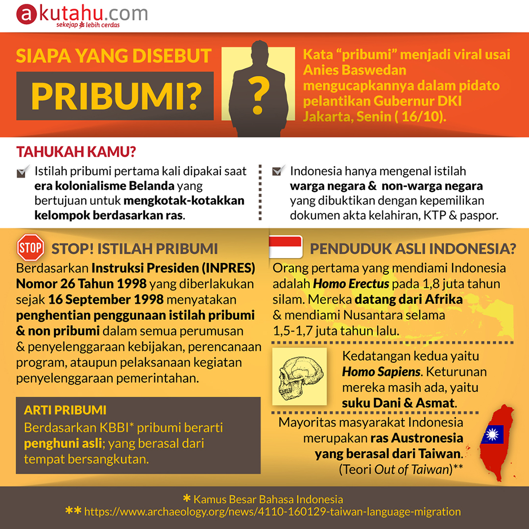 Kata ?pribumi? menjadi viral dan banyak diperbincangkan oleh netizen. Tahukah kamu bahwa kata ?pribumi? telah dilarang penggunaannya sejak 1998 melalui Inpres no 26. Kata ?pribumi? juga bermakna provokasi. Pada masa penjajahan kolonialisme, ?pribumi? sengaja digunakan untuk memecah-belah persatuan rakyat Indonesia yang terdiri dari beragam suku dan agama.